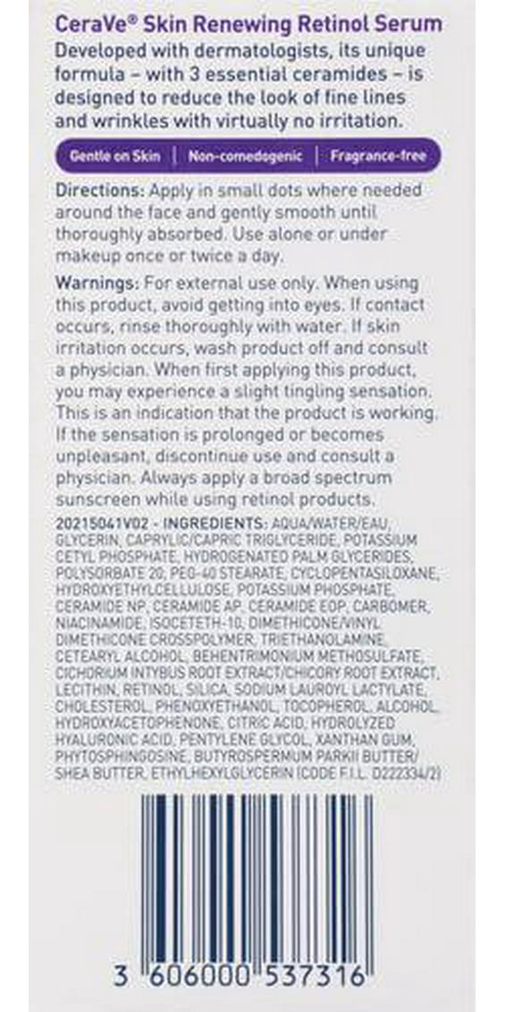 Developed with dermatologists, CeraVe Skin Renewing Retinol Serum reduces the look of fine lines and wrinkles without irritation.