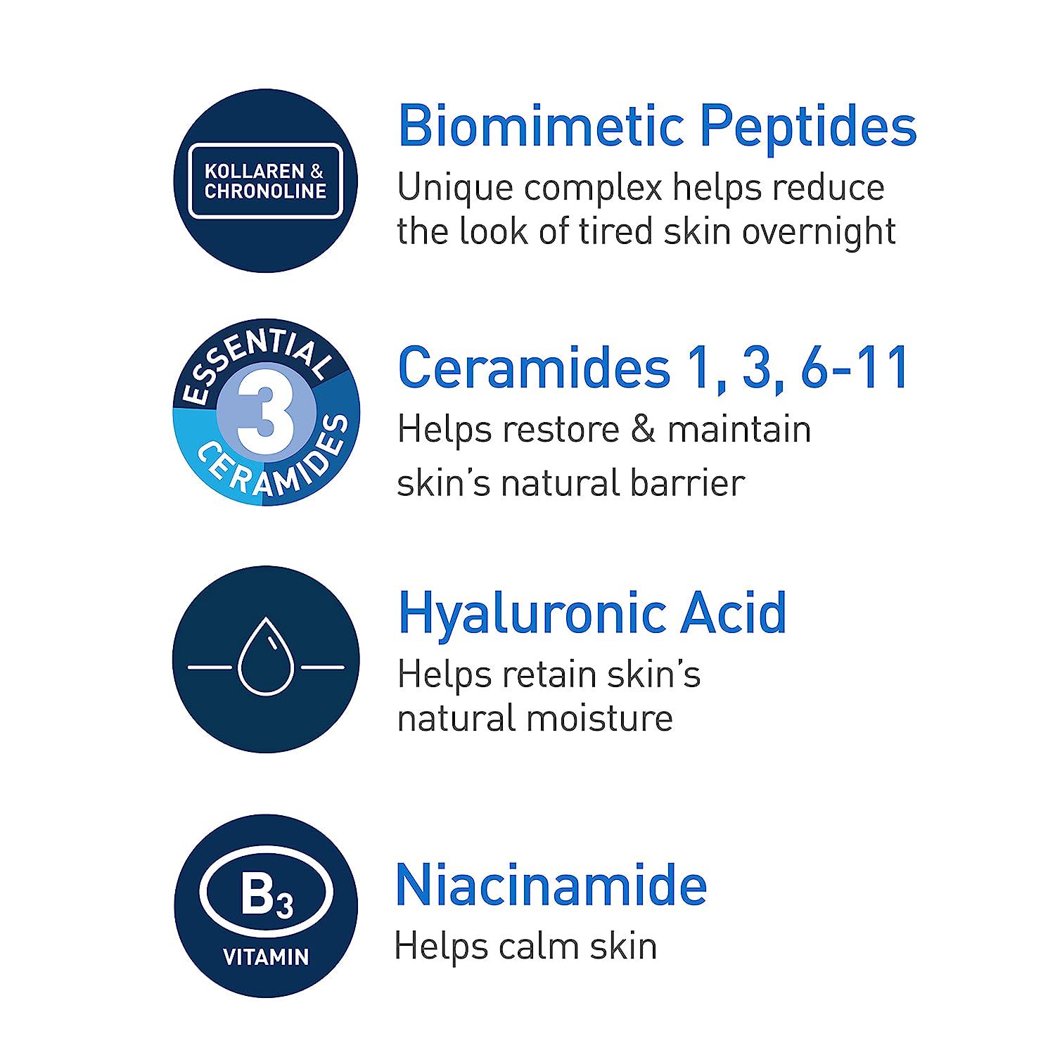 Developed with dermatologists, CeraVe Skin Renewing Night Cream is formulated with biomimetic peptides, hyaluronic acid, and three essential ceramides that work together to lock in skins moisture an help restore you skin’s protective barrier overnight. Wake up to skin that looks refreshed and renewed. This non-greasy, intensely moisturizing skin renewing night cream is designed to soften and renew the look of tired skin.