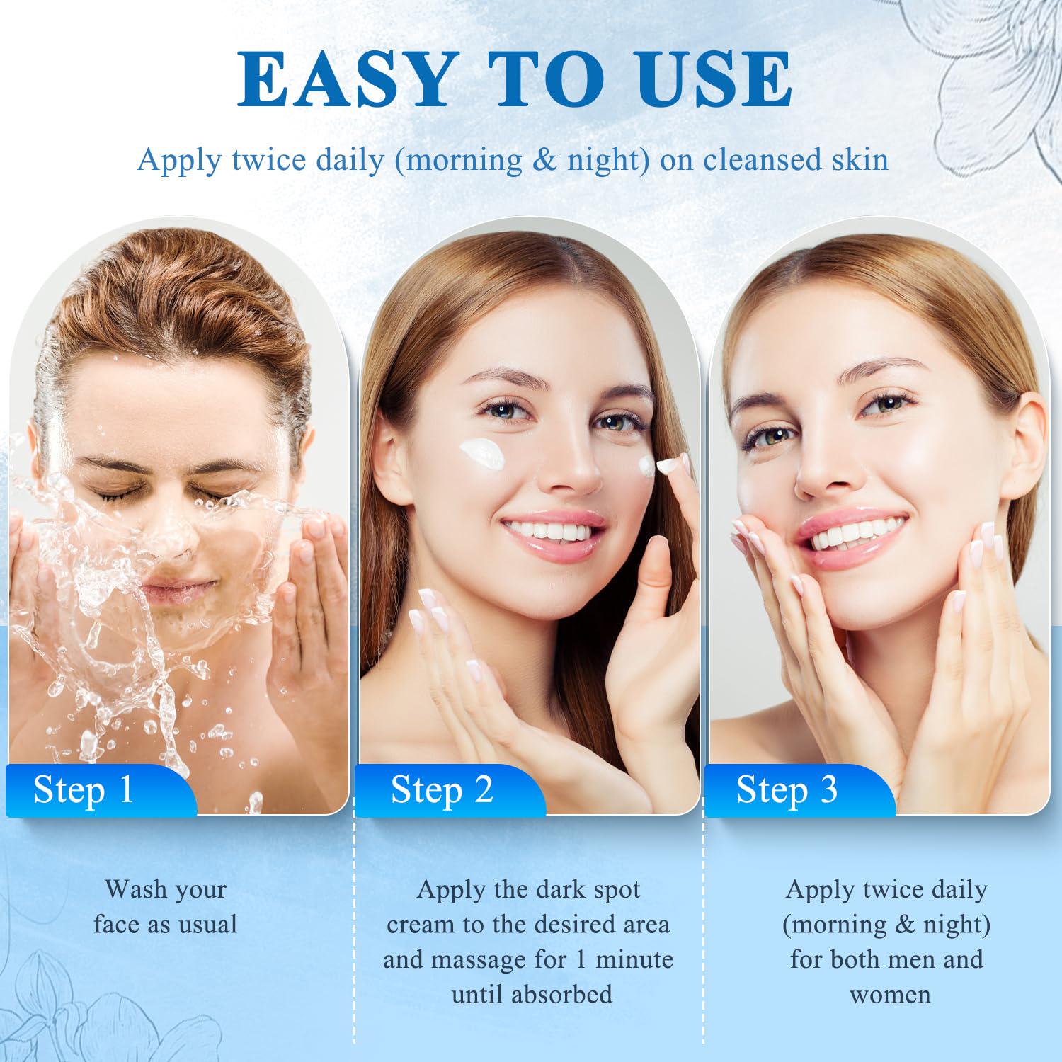 - Fast Results: Incorporate this dark spot remover for face into your daily skincare routine, use it every morning and evening after cleansing, and adhere to daily sun protection. You will see visible results in 4-8 weeks, with reduced dark spots and more radiant skin