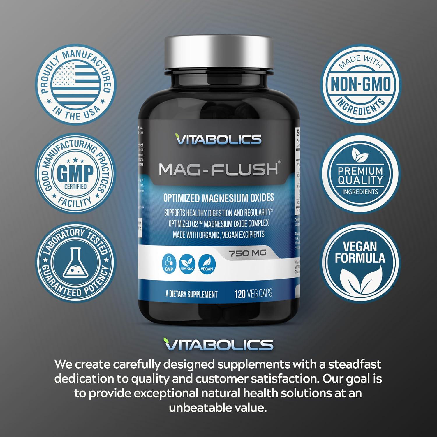 - EFFECTIVE CONSTIPATION RELIEF SUPPORT: Vitabolics Mag Flush provides fast-acting relief support from occasional constipation with 750mg of oxygenated magnesium oxide per capsule. More potent than magnesium oxide 400mg capsules and 500mg capsules.