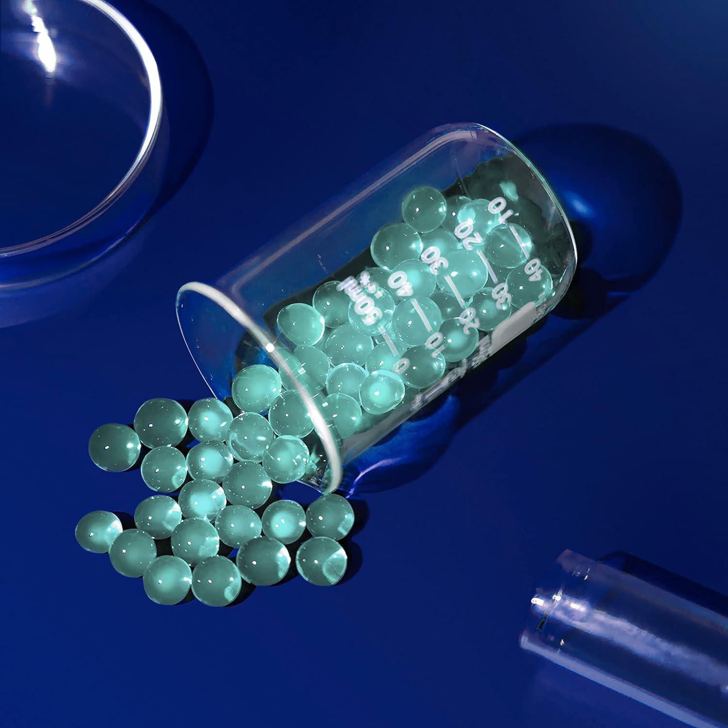 [Image of glass container with green caviar spilling out onto deep blue tabletop with beakers nearby.]